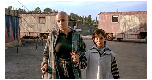 自分の居住区に戻ったカルーゾは、何かの薬を注射器に入れ、空気を抜いている(1枚目の写真、矢印)。そこに、頭を丸坊主にした女性(ジュリー)が、杖をついて入ってくる(2枚目の写真)。ジュリーが腕をまくると、カルーゾは、「新薬だ。これで 楽になる」と言って注射する。注射が終わり、ジュリーの顔が苦しみから解放されると、昔、カルーゾがラステリと名乗っていた頃、サーカスで、さっきバルブーが見た “回転する円盤” に固定された若きジュリーに向かって、火の点いたナイフを次々と投げている姿が映る。カルーゾは、昔ペアを組んでいたジュリーに、「チビの道化師を連れてきた。ラステリの再来だ。奴の才能には、びっくりするぞ。俺も、あれくらい お前に打ち込んでた。そっくりだ」と言う。その頃、カルーゾの居住区の前の広場では、鞭を持ったチンピラが中央に立ち、バイクに乗った少年たちが “バイクを使った窃盗の訓練” で叱られている。「まるでダメだ!」「下手くそ!」「遅すぎる!」(3枚目の写真、矢印はチンピラが肩に掛けていたバッグ)「何を モタモタしてる!」。最後に、マルセルが後部座席にバルブーを乗せ、チンピラから上手にバッグを盗み取る。チンピラは 「よし」と言い、それを窓越しに見ていたカルーゾも にんまりする。