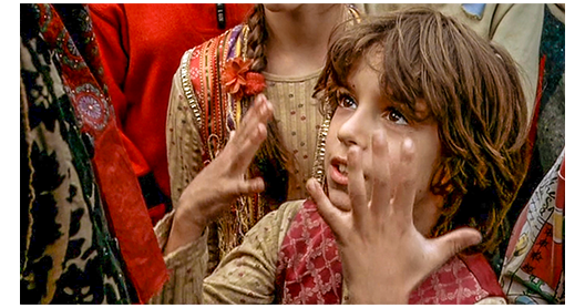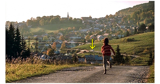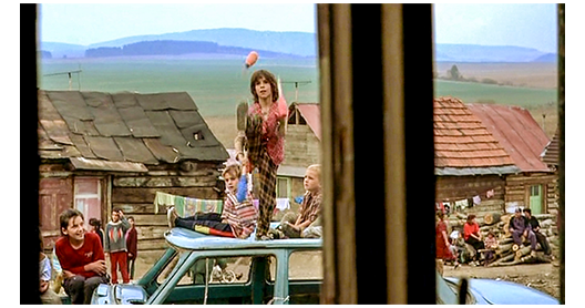 すると、遠くの方から、1990年製の古いジャガーが、もう1台のお付きの車を連れて村に向かって走ってくる〔私が昔乗っていたジャガー・ソヴリンも1990年製〕。そこで、映画の標題が表示される。村の広場では、バルブーとミマが布を敷いた上で、逆立ちをしたり、踊ったりしている。すると、車に気付いたバルブーが、立ち上がると、腕を上げて指差しながら、「カルーゾが来た!」と大声で叫ぶ。カルーゾの車が広場に入って来ると、村人や子供たちは、カルーゾの車の前にぎっしりと集まる(2枚目の写真、矢印はカルーゾ)〔これだけ人気があるということは、定期的に訪れているのか?〕。カルーゾは、村人に、「娘さんを、姫君にしてやる」「この子達は、最高の軽業師だ。ドイツ語が達者になったから、誰も戻りたがらん」「故郷に戻って来る者なんか、おらん」と言ってPRする〔通訳がドイツ語をウクライナ語に訳している〕〔少女は売春婦、少年はスリや泥棒として監禁状態で働かせるので、二度と故郷には帰れない〕。バルブーは、さっそくサーカスの軽業師として売り込む。スリとして有望だと思ったカルーゾは、「いくつだ?」と訊き〔通訳が繰り返す〕、バルブーは指を10本拡げて、「10」と言う(3枚目の写真)。