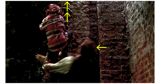 そのあとで、恐らく、所員はバルブーに服を着せた。だから、夜になってバルブーが施設から逃げ出した時には、ちゃんと子供服を着ている。バルブーは、またカサブランカまで走って行き、樋を登り始めるが、そこに車でやって来たカルーゾが、襟をつかんで引きずり下ろす(1枚目の写真、上向きの矢印は登ろうするバルブー、下の矢印はカルーゾ)。カルーゾは、バルブーをサーカステントまで連れて来ると、中央の床に投げ出し、「この、くそガキ!」と怒鳴り、鞭を振るう(1枚目の写真、矢印は鞭)。そこに、鞭の音とバルブーの悲鳴に気付いたジュリーが、銃を持って入って来て、「お止め!」と一喝する。カルーゾは、「うるさい! 失せろ!」と言っただけで、また鞭を振るう。ジュリーは、今度は、持って来た銃を両手で持ち、カルーゾに狙いを定めて、「お止め!」と言う(3枚目の写真、矢印は銃)。しかし、鞭打ちを止めないので銃を撃ち、弾は手に当たる(4枚目の写真、矢印は撃たれた手と、倒れたバルブー)。ジュリーは、倒れたバルブーの頭に触れ、バルブーはよろよろと立ち上がる。ジュリーは、次に、カルーゾに銃を向け、「跪け!」と命じる。銃がこめかみに突き付けられているので、カルーゾは仕方なくバルブーの前に跪くと、「悪かった、バルブー。許してくれ」と謝る。しかし、ジュリーが銃を向けながら、バルブーと一緒に出て行こうとすると、「この、くそったれ、あま! くたばっちまえ!」と怒鳴る。