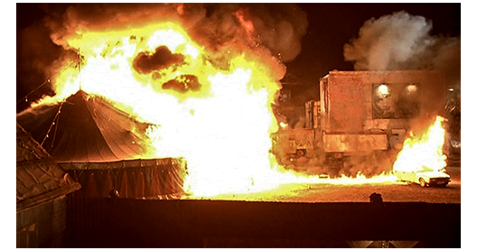 バルブーとミマは、駅まで走って行くと、動き始めた客車に飛び乗る。ジュリーがどうなったのかは分からないが〔死んだことは確かだが、放置されたのか、サーカステントまで運んで来られたのかは分からない〕。サーカステントの中に入ったカルーゾは、肩に “栓を開けたガソリン携行缶” を担ぐと、体を回転させてガソリンを振りまく。そして、回転する円盤にむかって、火の点いたナイフを次々と投げる(2枚目の写真)。しかし、ガソリンがまかれているので、円盤の火はテントに燃え移り、さらに、車に向かって伸びて行き、車も爆発する(3枚目の写真)。映画の最後は、バルブーとミマが、生まれ故郷の村に向かって走って行く場面で終わる(4枚目の写真)〔ベルリンからウクライナに行く直通列車はない。2人がどういうルートを選び、どうやって何度も国境を越えたのかは謎〕。