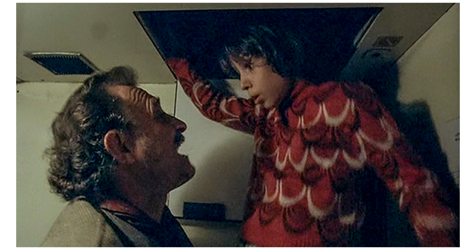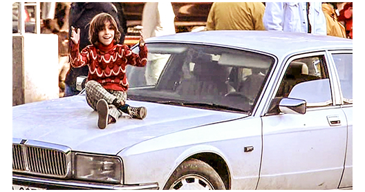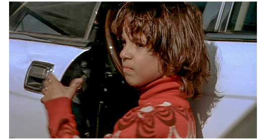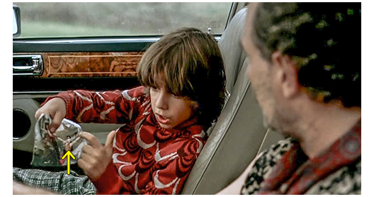それを聞いたバルブーは、ビアンカの制止も行かず、車に乗り込んだカーディナル目がけて銃を持って突進する。そして、ドアを開けると、「バルブー、怒った!」と怒鳴る。「何しやがる! 気違い チビ助!」。「これ、ほんもの!」(1枚目の写真、矢印)「コルト45。サイコーのやつ。くそったれを、ぶっとばす」〔かなり発音が間違っているが、一応、マルセルが言ったことを真似ている〕。カーディナルは、ただのオモチャだと思い、「やってみな、カーボーイ」と馬鹿し、「誰なんだ、チビ助?」と訊く。バルブーは、拳銃の向きを変え、ガラス窓に向けて1発発射し、ガラス窓に穴が開き、残りの部分は全面に細かなヒビが入る。こうなると、情勢は全く違ってくる。相手は子供でも、持っているのは本物のコルト45〔最強の銃〕で、撃ち方も心得ている。バルブーは、「ミマ、じゆうにしろ!」と怒鳴る。カーディナル:「この気違い!」。「黙れ! この、ゲス野郎! 吹っ飛ばしてやる!」。カーディナルは仕方なくエンジンをかけ(2枚目の写真)、ヒビだらけで見えないガラスを手で落とす。そして、車を走らせ、カサブランカに向かい、店の前に車を停める。バルブーは、すぐにドアを開け、銃を向けたまま車の後ろまで走って後退し、運転席から降りて来たカーディナルを狙い続ける(3枚目の写真)。次は、階段を登るカーディナルが映り、後ろから銃を向けたバルブーが、「歩け、バカ野郎。ゲス野郎!」と怒鳴り、カーディナルが、ウクライナ語を真似して、「げすやろう」と言うと、「とっとと歩け!」と怒鳴り、カーディナルが “この生意気のクソガキ” とでも言うように一瞬振り向くと、「振り向くな!」と、また怒鳴る。