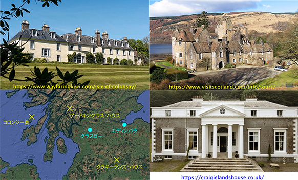 また、映画の中では、主人公一家が暮らしているのは、キロラン・ハウス(Kiloran House)になっている。しかし、これは実際に1905~17年頃まで実際に一家が実際に住んでいたコロンジー島(Isle of Colonsay)にあるコロンジー館(Colonsay Estate)を言い換えただけ。コロンジー島は、デニス・フォーマンの祖母エイミー・スミスの叔父にあたる初代Strathcona and Mount Royal男爵が1905年に購入し、男爵からすれば姪にあたるエイミーの一家に島の管理を任せていた。しかし、一家は1917年10月にデニスが生まれる前に、スコットランド南端に近い、祖父が1892年に購入したクラギーランズ・ハウス(Craigielands House)に引っ越し、管理者から領主に格上げしていた。映画では、それを無視し、1917年の10年後の1927年にも、コロンジー島に住んでいるように見せている〔海が近くにあるから〕。映画と現実に関係のある場所(地図)と写真を、下に示す。かつて一家が暮らしていたらしたコロンジー館は左上の写真。映画の舞台となる1927年に、一家が実際に住んでいたのは右下のクラギーランズ・ハウス。しかし、この辺りは、ほぼ平坦で、湿地帯が拡がっていて、映画に出て来る水苔の栽培には最適だが、海も山もないのでスコットランドらしくない。そこで、映画の撮影には、コロンジー島に似た雰囲気のアードキングラス・ハウス(Ardkinglas House)が使われた(右上の写真)。