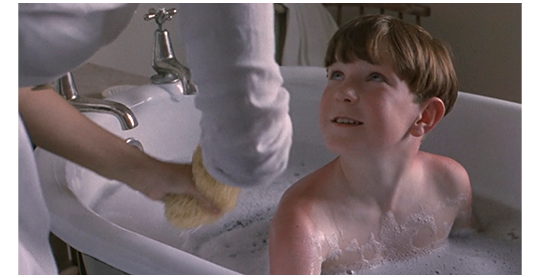 ここも原作と完全に無関係なので、簡単に。さっき、「肺炎」と言っていたフレイザーは、下着のパンツ1枚だけで、部屋から出ると、ノックもせずに祖母の部屋に入って行く。祖母が口をポカンと開けて眠っていたので、失礼にも、死んだかと思ったフレイザーは、ベッドの手前の棚に置いてあった手鏡を取ると、ベッドの上に乗って、祖母が息をしているか確かめる(1枚目の写真)。びっくりして目覚めた祖母は、①外に出て行って待て、②勝手に部屋に入るな、と申し渡す。そして、パンツ1枚で座っているフレイザーの前まで行くと、彼が肺炎なのに、病気の具合を訊くこともしない。フレイザーは、これも、非常に失礼なことに、祖母が死んで伯父が家を継いだら、自分はどうなるかを訊く(2枚目の写真)。そのあと、フレイザーは、祖母の命令で、使用人の女性に風呂に入らされる(3枚目の写真)〔肺炎患者の入浴には測熱が必須なのに、それもなし〕。風呂の中で、フレイザーが何度も使う「slanking」という言葉は、存在しない単語。恐らく、バカな脚本家が、観客に、「何だろう?」と思わせるために勝手に作った造語〔prostitute、lubricious、orgy、fellatioなどの単語を、意味を知った上で間違えずに発音できるような子が、既往の単語を言い間違えるとは思えない〕 。原作には、全くないシーン。