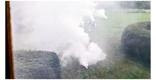 セントラルヒーティングの工事は実話より早く、その年のうちに終わり、エドワードは新しいボイラーに点火して試験運転を始める。すると、芝生に埋設された土管の複数の継ぎ目から蒸気が漏れ、庭に噴き出て真っ白になる(1枚目の写真)。これは、以前、エドワードが模型で示した、「煙突から出た煙が子供部屋に行かないよう、芝の下に水平に土管を敷設し、遠くの煙突から排出するという案」の欠点が明らかになった瞬間。しかし、これには、映画ならではの小細工が隠されている。そこで、まず、原作の失敗について、事後談を含めて解説しよう。館が工場のように見えることを嫌ったアダムは、既存の煙突を使わず、庭に水平の管を埋め、遠くの煙突から排出する案で工事を進めたことは先に述べた。その結果、「ボイラー → 各部屋のパネルヒーター → 水平に置かれた土管」に達した “まだ暖かい排気” は、垂直に昇ろうとはするが水平移動にほとんどしないので、長いトンネルを通過できず、煙突に到達する前に煙が冷えて滞留する。逃げ場を失った煙は、ボイラー室や屋敷の隙間から “逆流” し、家中を煤だらけにしてしまう。アダムは仕方なく専門家に相談し、結局、土管や “遠くの煙突” は廃棄(お金がかかるので放置)し、既存の煙突の内部を補強し、館内部の配管を変更してセントラルヒーティンの工事を終えた。最初から館の煙突を使って工事をしていれば、実際に要した費用の1/3~1/10くらいで済んだと推定される。一方、エドワードの工事は、同じ条件下で煙が “逆流” せず、土管の隙間から水蒸気と言う形で漏れ、それが庭に溢れ出る。なぜ、このような違いが生じたのか? AI を交えた議論の結果、この白煙は映画の欺瞞と言うことで意見が一致した。映画の製作者がこの方法を選んだのは、1つには、「失敗」が非常に分かり易く映像化できたこと。そして、AI が指摘した2番目の理由は、私にも考えつかなかった。それは、この映画は、あくまで借りた城で撮影されており、原作のように、室内の壁紙が煤で汚れるような状況を実際の建物で撮影することは不可能で、セットを使うにせよ、大変な手間がかかる割に、「庭からの水蒸気」に比べてインパクトが乏しいというもの〔少し、脚色して書いた〕。その意見には、なるほどと感心した。因みに、キロラン・ハウスにはクラギーランズ・ハウスと違って既存の煙突はなく、エドワードの失敗した工事には、それ以上改善の余地はなく、すべてを破棄するか、キロラン・ハウスに新しい煙突を建てる以外に途はなかった。監督は、ずるいことに、事後談は隠して何も言わない。ここで場面が変わり、フレイザーが、自分のベッドのマットレスの下に隠していた “エロイーズの首飾り” を母が見つけ、「これ、どこで見つけたの?」と訊く。フレイザーは、「水苔の倉庫だよ。エロイーズ伯母さんが失くしたんだと思うよ」と答える(2枚目の写真、矢印)。母は、フレイザーの晩餐会でのフレイザーの発言「今朝、パパが水苔の倉庫にいたの見たよ。女性が叫んでた」と合わせ、何があったかを推察し、顔が曇る。すぐに場面は変わり、エドワードが、ワイヤー・メッシュ・スクリーン〔細い針金(ワイヤー)をスポーク状に張り巡らせたホイールを高速回転させ、そこにフィルムの映像を投影する映写装置〕の上に、伯父とエロイーズが屋敷を訪れた時に撮影した映像を、フレイザーに見せる(3枚目の写真、矢印は「針金を45度ずつスポーク状に並べた構造」が見える場面)〔なお、現在時々見かける3D LEDファンは、映写機のからのフィルム映像を高速回転させたホイールに反射させるのではなく、LEDを高速点滅させて「発光」させている〕。1923年にコダックが発売した16mmフィルムにより裕福層の一部では撮影が始まっていたので、この映像の存在は歴史的には間違いではないが、このワイヤー・メッシュ・スクリーンはエドワードだけの発明。家族の娯楽など一切無視した原作のアダムは、このような物を作る人物ではなかった。
