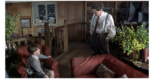 ここからは、ベッドに入ったフレイザーのナレーション。「百科事典には、女の子と踊ることは感覚的な喜びの一つだと書いてあるけど、僕はゲイ・ゴードンスなんか楽しくなかった」。そして、ベッドに横になったフレイザーが、すっぽりシーツをかぶり、懐中電灯で光を当てて “裸の女性が大勢描かれたルネサンス期の1枚の絵を見ている(1枚目の写真)。「僕は、乱交とかいうものや、ハーレムについて読み、そのあと 僕は眠って、エロイーズ伯母さんの夢を見た」。翌朝になり、フレイザーは恐らく夢精をしてしまい、おねしょと勘違いする。父は、「フレイザー、お前がそういう夢から目覚めた時、ベッドが濡れていて、しかもそれがとても素敵な夢だったとしたら…」と言い始めるが、フレイザーは、「滅多にないよ。僕、もうほとんどおねしょしなくなったから」と話を遮る。「将来、心の奥底、お前の存在の核心から、何かが込み上げてくるのを感じた時…」。「マグマみたいに?」とまた遮る。「まあ、そうだが。だが、とても素敵な夢を見た時には…」。「僕も素敵な夢、見るよ。エロイーズ伯母さんがジャズを演奏している夢、見たんだ。音楽付きの夢なんて、それが初めてだった」と、これで3回遮る。「いいか、次に夢の中で音楽を聴いたら、朝起きたらすぐに私と一緒に湖まで走って行き、冷たい水に飛び込まないといかん。“健全な精神は健全な肉体に宿る”。これで全て解決する。それで、フレイザー、何か他に聞きたいことはあるか?」。「パパ、“乱交” って何なの?」(2枚目の写真)「それに、“フェラチオ” って、天国で天使たちが吹くトロンボーンみたいなものなの?」。「フレイザー、どちらも、いわゆる “肉欲の誘惑” というものなんだ」。「それって何?」。「それが何なのか教えてやろう。それは どんな犠牲を払ってでも、抵抗すべきものなんだ」(3枚目の写真)。原作には、全くないシーン。