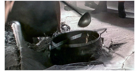 真冬になり、以前の晩餐会の際、男性が口にした「ボンスピール〔カーリングの大会〕」が、遂に開かれる。そこには、フィンレイソン牧師の担当教区に住む鉱山労働者たちが数多く参加している〔総勢200名くらい〕(1枚目の写真)。映画の中のカーリングストーンはハンドルの部分の形状は現在のものと違うが、材料が高密度の花崗岩という点では同じ。ブラシは、現在と違って原始的な竹ほうき。靴は、材料は違うが、形態は現在のカーリングシューズに似ている(2枚目の写真)。この映画だけの場面は、主人公のフレイザーとほぼ無関係なので、ショートカットし〔架空、かつ、無意味な会話を訳しても仕方がない〕、最後の重要な場面だけ紹介する。辺りが暗くなり、ガンマは、ハギス〔羊の内臓を主原料とした、スパイシーで食べ応えのある郷土料理〕の入った鉄の大釜を氷の上に持って来させ、自ら陶器の皿に盛り付けて人々に配る。しかし、カーリング大会は水平な場所で行わねばならず、ここではそれが氷の張った湖だった。そして、大釜の熱と重さで、突然氷に穴が開き、釜とガンマが湖の中に落ちる(3枚目の写真)。「氷の張った湖でカーリングを行う場合、安全のために少なくとも10〜15cm以上、人が集まる場合は20cm以上の強固な氷の厚さが必要なのに、人どころか大釜の周辺の割れた氷の厚さは2cmほどしかない → 現実を無視し、観客に “割れて当然” と思わせる “薄さ” にした、その姑息さ! 原作には、全くない、でっち上げ!