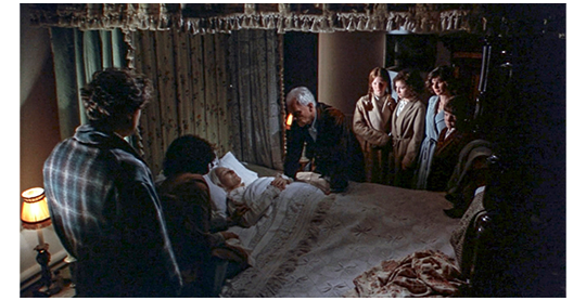 ガンマは、この0℃に近い冷水への転落時の低体温症が原因で、数週間後に肺炎で死亡する(1枚目の写真)。なお、ガンマに該当する、原作のエイミー・スミスは1927年ではなく1932年に死亡する。5年の差は少ないように見えるが、実際には、1927年以降数年続くアダム・フォーマンの無駄使いで、エイミーが夫から受け継いだ信託財産はどんどん目減りし、クラギーランズ・ハウスにおける経済状況も悪化していく。その後の場面は、館で開かれたフューネラル・ティー〔Funeral Tea〕と呼ばれる伝統的な集まり。フレイザーのナレーション:「キロランは一変してしまった。ガンマはキロランそのものだった。そして、僕たちがずっと知っていた世界は、ガンマと共に静かに消え去った。ガンマは遺言で、地所をモリス伯父さんではなく、僕たちに遺すことに決めた」「クロフォード叔父さん〔映画だけの存在〕が、ママに、イエスについて延々と話すのをやめてくれればいいのに」。そして、クロフォードがモイラに向かって、「イエスが、ガンマの手を握られた」と言うと(2枚目の写真)、フレイザーの怒りが爆破し、「まさか、そんなことしないよ! とんでもない嘘だ! ママを慰めるために、そんなこと言ってるだけじゃないか。ところが、それが、ママの気分を悪くしてるんだ」と強く批判する(3枚目の写真)。もちろん映画だけの場面だが、原作のデニス・フォーマンを、性的に異常な少年だけでなく、思ったことをずけずけという失礼な人間として描き、ニ重の侮辱を与える嫌な構図。