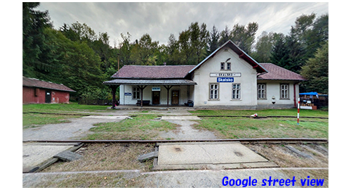 リボルが目を覚ますと、ディーゼルカーは停まっていて、車内には誰もおらず、なぜかリボルの靴と靴下がなくなり、裸足になっていた〔このシーン、理由はさっぱり分からない。①なぜ、運転手はリボルを残して下車したのか? ②なぜ、裸足なのか?〕。リボルがディーゼルカーのドアから外を覗くと、駅舎には「スカルスコ(Skalsko)」と掲示され、その前に山羊が1頭つながれている(1枚目の写真)。この駅舎は、プラハの中心から約45km東北東に実在する現役の駅舎で、2枚目に、Google street viewの写真を示す。駅舎の端に脚が見えたので、リボルは 「今日は!」と叫び、それでも反応がないので、もっと大きな声で「今日は!!」と叫ぶ。すると、老人〔駅員ではなく山羊の世話をしている〕が顔を出したので、「このディーゼルカー、次はどこに行くのか教えてもらえません?!」と、叫ぶように訊く。「どこにも行かん。ここが終点じゃ!」。リボルは、ディーゼルカーから下りると、老人の前まで行き、「ここに、電話ありますか?」と訊く。「線路づたいにセドリツェ〔架空の町〕まで行くがいい。そこに郵便局がある」と教える。そこで、リボルが教えられた方角に歩き始めると(3枚目の写真)、「今はちょうど昼休みじゃ」と老人が言ったので、リボルは老人の所に戻り、「できるだけ早く、電話まで行かないと」と助けを求める。すると老人は、「そうか。ならパネンコの家に行けばいい」と言う。「その家、どこにあるんです?」。老人は、さっきとは反対側を指して、「線路づたいに次の駅まで行くんじゃ」と教える。「だって、あなた、ここが終点だって言ったじゃない」(4枚目の写真)。「今は廃止になって、線路は撤去されたんじゃ」〔実際は、廃線にはなってない〕。