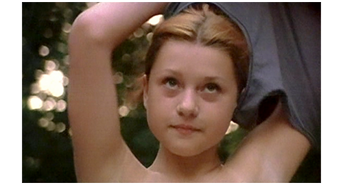 4番目のシーンでは、まず、マルセラの顔が映る。そして、彼女は、意を決したように、着ていたシャツを脱ぐ(1枚目の写真)。それを横目でびっくりして見ているリボルの顔が映ると(2枚目の写真)、次は、池の前に立っている2人の後ろ姿が映る。マルセラは全裸で、リボルはパンツだけ(3枚目の写真)。リボルも意を決してパンツを脱ぎ、2人は全裸で並ぶ(4枚目の写真)。そして、一緒に池の中に入って行く〔マルセラは、犬をあげたり、レッドカラントでキスしたり、こんなきわどい行動までするので、リボルが好きに違いない〕。