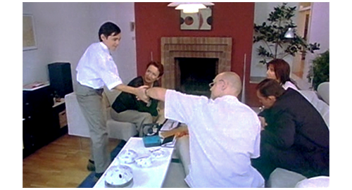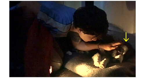 リボルが居間に入って行くと、伯父と伯母は、夫婦で来た顧客と恐らく家の設計について話し合っている最中だった。それでも、伯母は、「あら、早いのね」と言い、リボルは伯母の両方の頬にキスする。そして、伯父の前を通ると、彼は 「車はどうだった?」と訊き、リボルの 「よかった」で、両手をパチンと合わせる(1枚目の写真)。この仲良さそうなシーンだけ見ると、リボルが両親と会ったように見えてしまう。しかし、リボルが、「初めはスムースだったけど、プラハに入ると、亀みたいにゆっくりで…」と話し始めると、伯母が、「座ってて。今、打ち合わせ中なの、すぐ終わるわ」と言う。リボルは、奥の丸イスに乗っていた黒猫のザラを抱き、丸イスに座る。リボルはすぐにザラの異常に気付き、ダニがいるに違いないと、ザラをひっくり返して調べる。その度にザラがニャーと鳴き、打ち合わせの邪魔になると、伯母が嫌な顔をして何度もリボルを見る。リボルは、遂にダニを見つけ、伯母の前までザラを抱いていくと、「見て、豆粒くらいのダニだよ」と言って、ダニを見せる。伯母は 「分ったから、すぐ捨てなさい!」と叱り付けるように命じる(2枚目の写真、矢印はザラとダニ)〔「何て不衛生な家か」と思われるのを嫌った〕。リボルは、猫を抱いたままキッチンに行き、夕食に何か食べようと、小さなテーブルの上のパンを見るが塗る物がない。冷蔵庫を開けるが、中には小さなビン1本、小さな缶詰1個、皿の上にごく小さな球状のもの3個の3つがあるだけ。リボルは、缶詰を取り出すと、猫の絵が描いてある。ザラの餌だと思い、床に置いてあるザラ用の皿に少し入れるが、お腹が減っているので、缶の裏の原材料を読む。「牛肉、ゼラチン、動物性脂肪、ビタミンB、C、D、E、β-カロテン、タンパク質、カルシウム、天然フレーバー」。これなら人間が食べても大丈夫と思ったリボルは、パンを缶の中に突っ込むと(3枚目の写真、矢印は缶)、パリパリと食べる。それから、自分の部屋に行くと、「世界の創造主(Stvořitel svĕta)」というコンピュータ・ゲームを立ち上げ(4枚目の写真、矢印)、野原、木、動物、家を作っていき、完成した風景をプリントアウトし、「こんな家に住んでみたいな」とザラに話しかける。初めて週末に帰宅したというのに、金曜の夜遅くまで仕事で無視され、放っておかれるとは、何と冷たい伯父と伯母なのだろう。