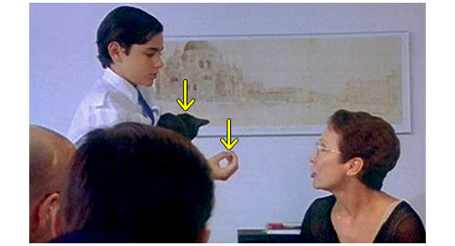 リボルは、田舎の一軒家に連れて行かれ、汚い部屋に入れられ、ドアの入口に重い棚が置かれ、逃走できないようにされる(1枚目の写真、矢印)。それにもかかわらず、部屋の中では右手の手錠がかけられ、動くこともままならない(2枚目の写真、矢印)。一方、伯母はリボルの学校に行き、「最近、リボルの様子が少し変だと感じたことはありますか?」と、同じ部屋だった生徒2人に質問する。「彼、時々、物を売ってたよ」。「どんな物?」。「ナイフを売ってくれたんだ。クリストフは、コンピュータ・ゲームを買ってた」。「お金が要るって言ってたの?」。「うん」。ここで、教師が、「何のためだか知ってるか? リボルが、家を出てこうと思ってるってサジェストしたことあるか?」〔伯母が、最初から “家出” を前提に質問に来たので、相手の思考も捩じられてしまっている〕。その時、金曜にリボルが学校を出て行く時に、「もしかしたら、戻らないかも!」と冗談を言ったのを聞いた方の生徒が、「金曜に帰って行く時、彼、戻らないかもしれないって言ってた」(3枚目の写真)と発言する。それを聞いた最初の生徒が、「彼、伯母と伯父は、自分のためにぜんぜん時間を割いてくれないって言ってた。いつも仕事ばかりだって」と、事実を述べる。しかし、伯母は、自分に都合の悪い話は無視し、教師に、リボルが学校でどんなだったかを尋ねる。教師は、「彼は問題を抱えていたと思います」と答える〔何れにせよ、伯母が、リボルが “家出” したという思い込みに対し、それが自分の落ち度のせいだと認めることを拒否し、あくまでリボルが “悪い” と決めつけようとしていたことが後で判明する〕。