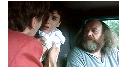 トイレが終わったリボルは、2人の男に乱暴に掴まれ(1枚目の写真)、顔に拳銃を突き付けられ、「ちょっとでも声出してみやがれ」と脅される。誘拐犯の老人の方は、リボルのズボンのポケットから、さっき伯父が渡した1000コルナ札〔2001年7月の為替相場で3200円〕を奪い、そのまま、リボルの口を押えてトイレから出ると、すぐ横に付けたバンの後部に放り込む(2枚目の写真)。マデラは、リボルが戻って来ないので、トイレも含めてあちこち探すがどこにもいない。そこで、携帯で伯母に連絡する。一方、プラハから相当離れた田舎まで来たバンの運転席では、若者の誘拐犯が、「黙ってろ、警官には一言も言うな、金を用意しろ」と、“両親” に要求する内容を口に出している。老人の方は、「奴らを怖がらせるほど、ガキのためにたくさん払うぞ」と言う。それを聞いたリボルは、「誰が、僕なんかのために払ってくれるの?」と尋ねる。若者:「『誰が』だと? お前の親父に決まっとるだろ? 100万、200万、それとも、300万〔960万円〕か?」。「だけど… 僕の父さん、死んじゃった。母さんもだよ」。それを聞いてびっくりした若者は、リボルの上半身を運転席に引っ張り込み、「何だと?!」と怒鳴る(3枚目の写真)。「父さんと母さんはもう亡くなった。僕の伯母さんと伯父さんが、僕を育ててる」。老人:「誰が育ててようが構わん。あのマンションや、車や、財産は誰のだ?」。「みんな、伯父さんと伯母さんのだよ」。それを聞いた若者は、リボルを車の後ろに突き放す。2人は、車から出て10mほど先まで行き、これからどうするか話し合う。リボルは、その隙に逃げようと、運転席まで何とか出て来るが、バランスを崩してハンドルにぶつかり、クラクションを鳴らしてしまう。2人が走って戻って来たので、リボルは後ろに戻るが、逃げようとしたことで乱暴に殴られる。